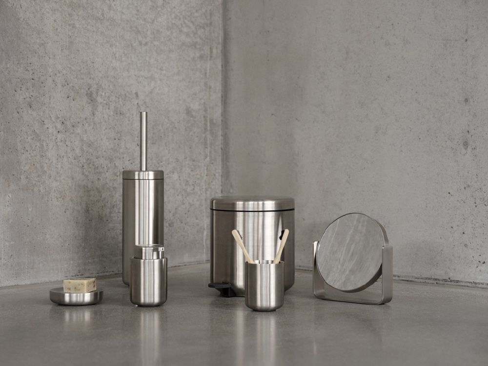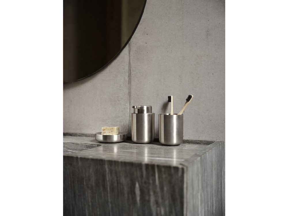 人気バスルームコレクション「Ume」シリーズより、特別仕様の歯ブラシスタンドが登場。無駄を省いた洗練されたフォルムと、丸みのある柔らかなラインが魅力のアイテムです。本体は程よい重量感のあるスチール製で安定感があり、洗面台の上でもしっかり自立。シンプルながらも上質な存在感を放ち、光の反射によってマットな質感にさりげない輝きが生まれます。