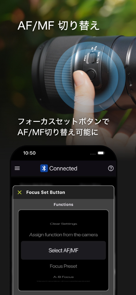 TAMRON-LINK(TM)をタムロンレンズに装着することで、スマートフォンからレンズの各種機能を無線通信(Bluetooth)で操作できるようになります。