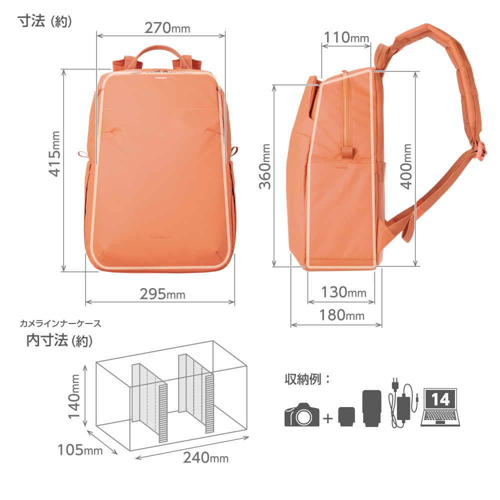 着脱可能なインナーケース仕様に加え、14 インチ PC スリーブや A4 対応ポケットを備え、機材と日用品をバランスよく収納できます。