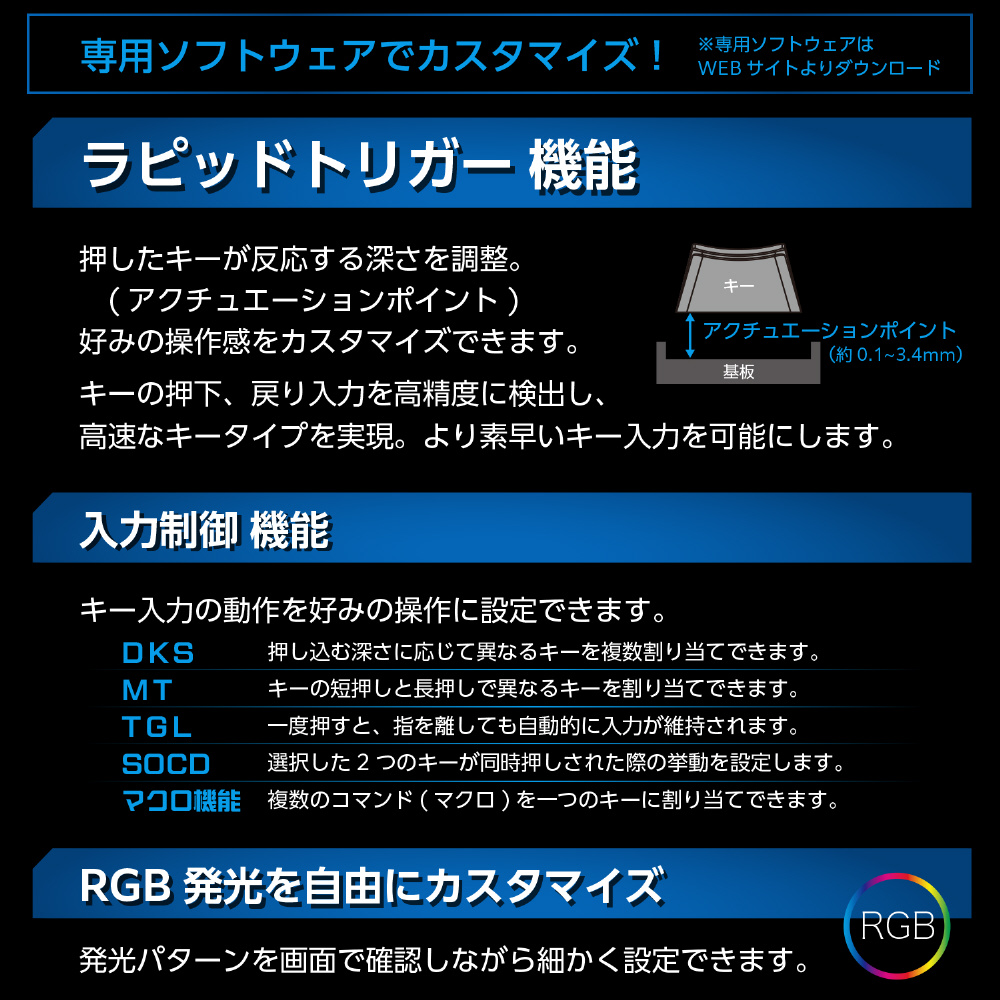 ■ラピッドトリガー機能搭載。キー押下/リリースの反応する深さを0.01mm単位で調整でき、より素早いキー入力が可能。