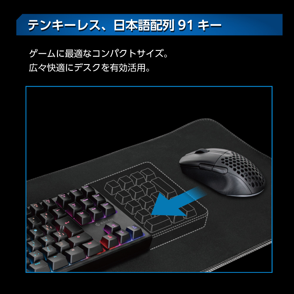 ■日本語配列・テンキーレスレイアウト。マウススペースを広く確保できる、ゲームに最適なコンパクトサイズ。