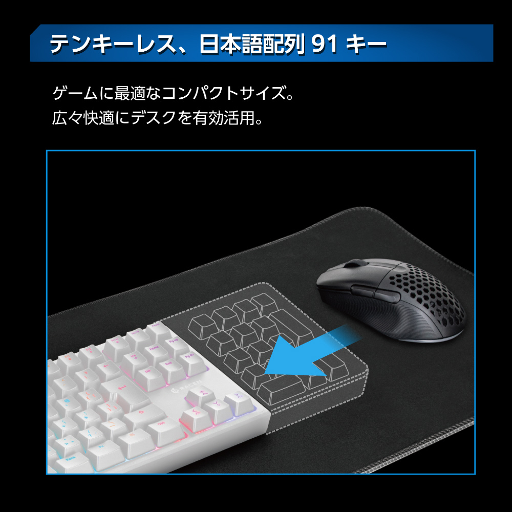 ■日本語配列・テンキーレスレイアウト。マウススペースを広く確保できる、ゲームに最適なコンパクトサイズ。