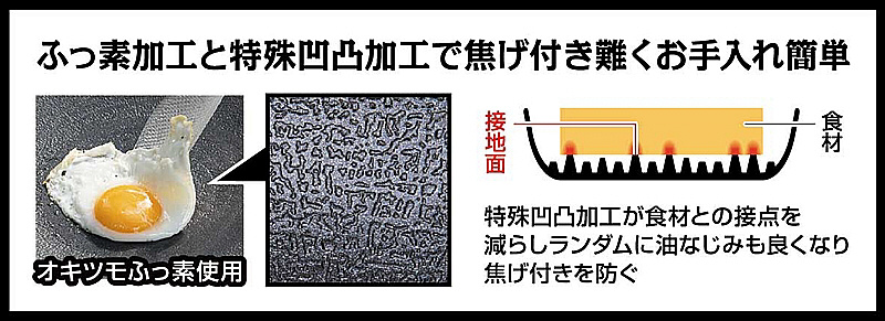 フッ素加工と特殊凹凸加工で焦げ付き難くお手入れ簡単。