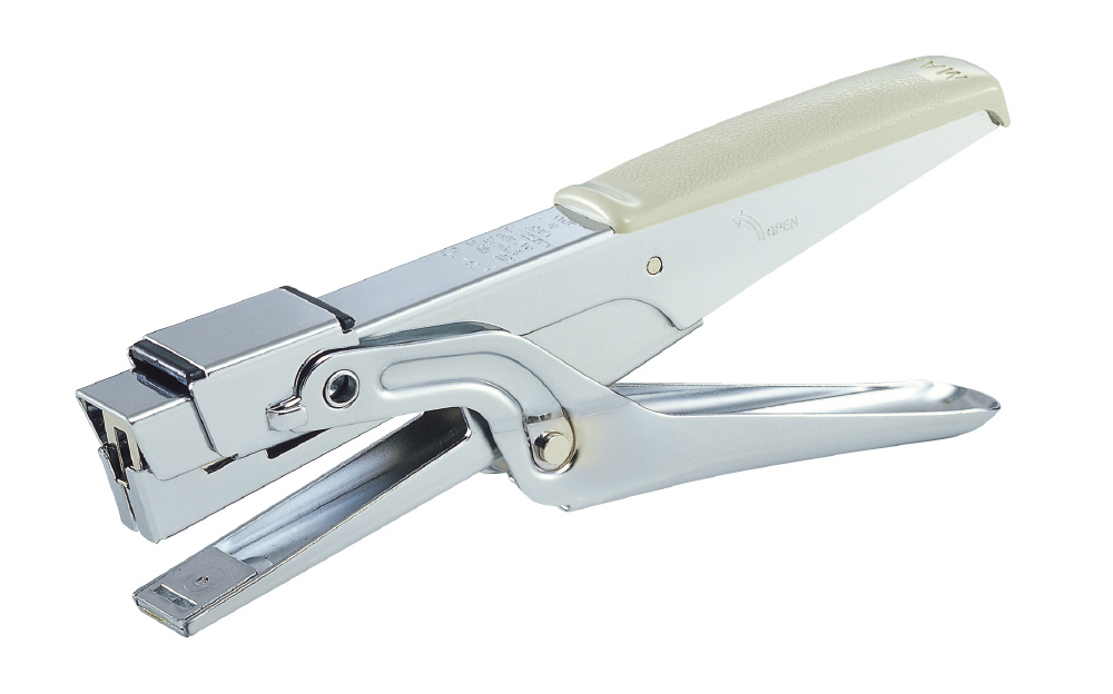 100本の針が装てん可能のプライヤータイプホッチキス。紙袋、ビニール・ポリ袋とじにおすすめ。
