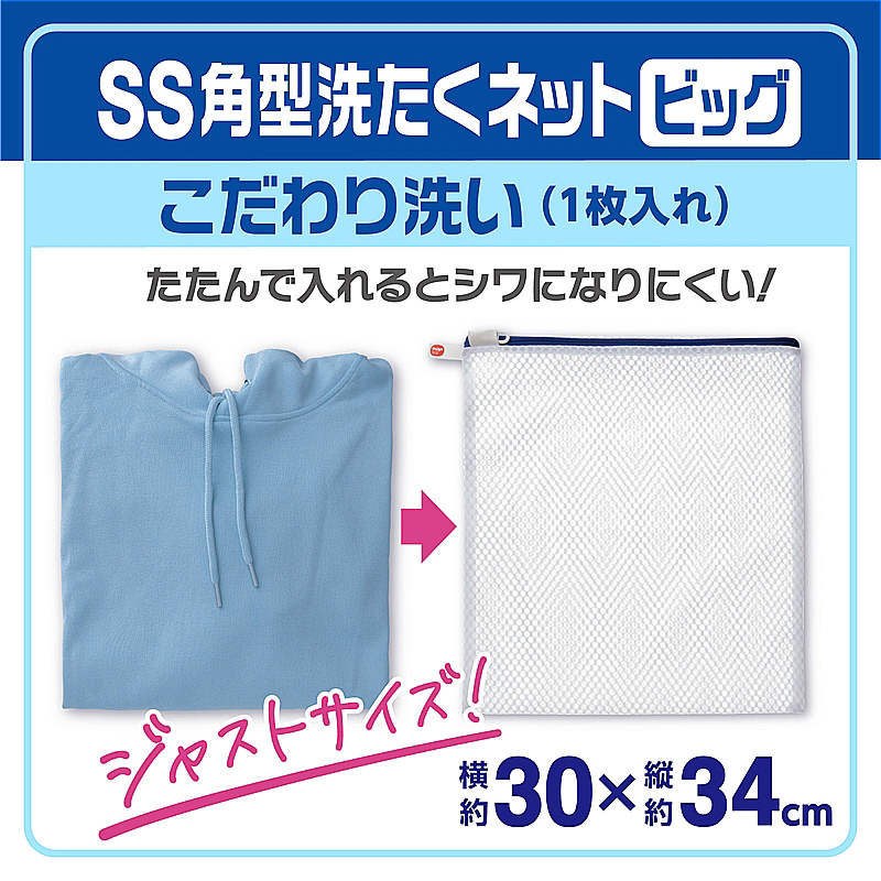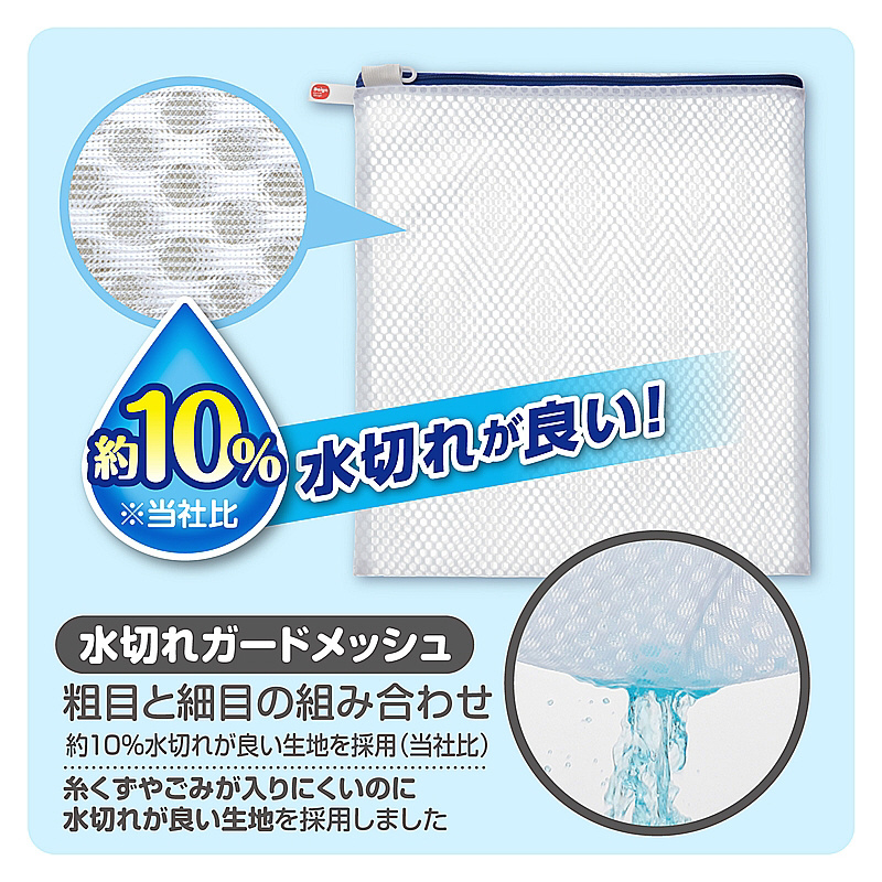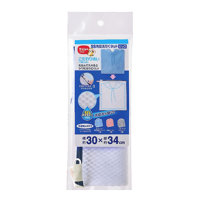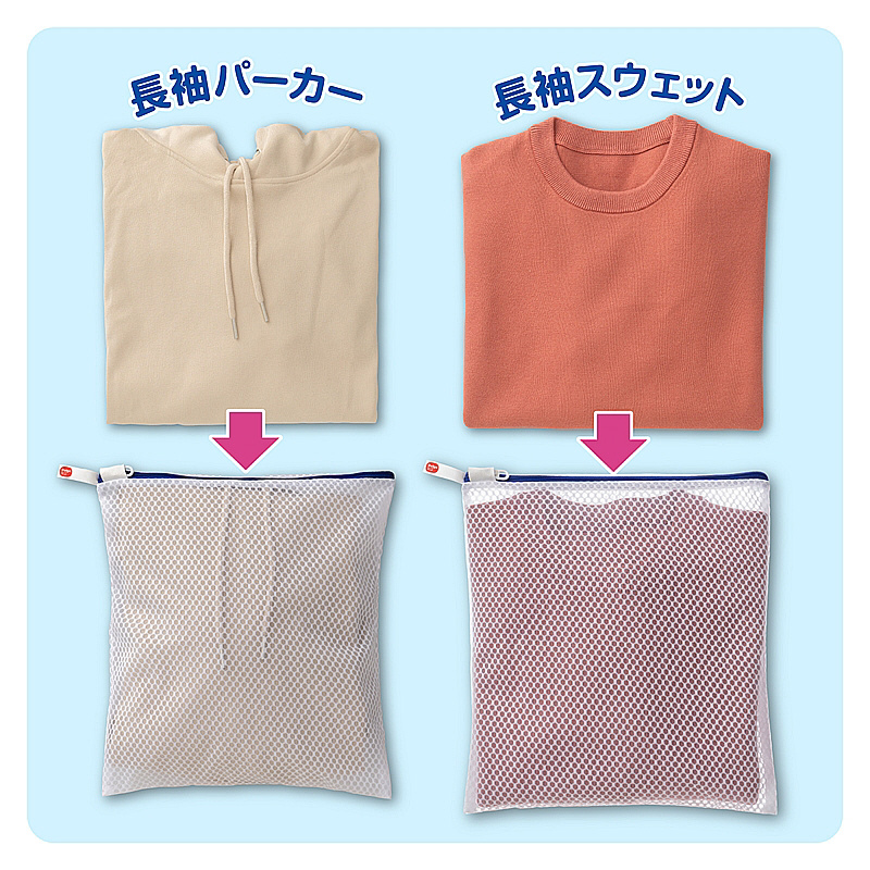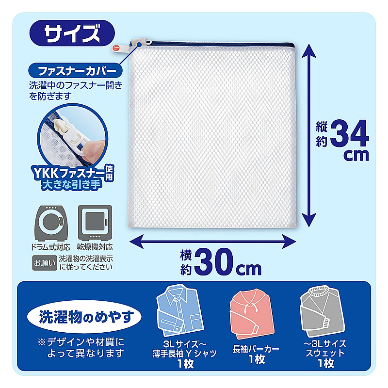 最近の服の傾向や流行に合わせて洗濯ネットのサイズを見直しました。衣類を畳んでネットに入れるとシワになりにくいジャストサイズです。こだわり洗いの1枚入れ(3Lサイズ〜薄手長袖Yシャツ1枚、長袖パーカー1枚、〜3Lサイズスウェット1枚)YKKファスナー使用。ファスナーが開けやすい大きな引き手。衣類が入れやすいようにファスナー位置を上部にしています。掛けて収納しやすいループ付き。水切れガードメッシュ生地を採用。