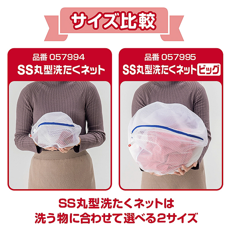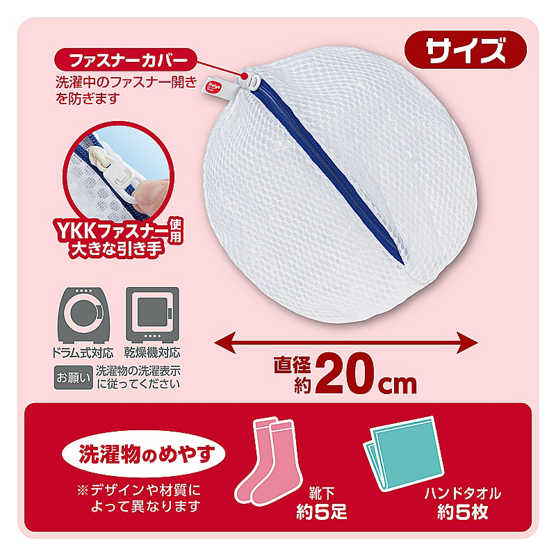 小物のまとめ洗いにおすすめ。ネット内でからみにくい丸型。絡まりやすい衣類をまとめてスッキリ洗えます。(靴下約5足、ハンドタオル約5枚)YKKファスナー使用。ファスナーが開けやすい大きな引き手。掛けて収納しやすいループ付き。水切れガードメッシュ生地を採用。約10%水切れが良い。※当社比。糸くずやゴミが入りにくいのに水通しが良い生地です。