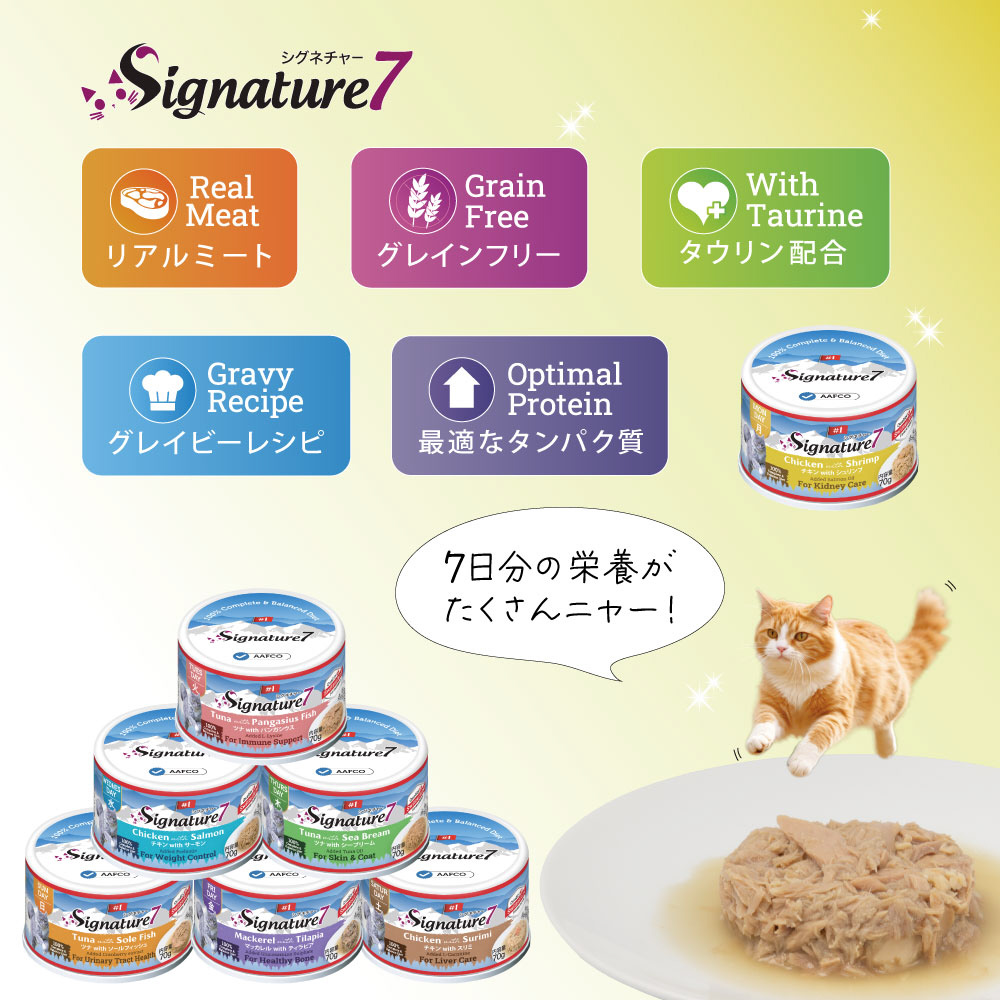 1週間毎日違うフレーバーが楽しめる総合栄養食!■詳細説明・オールステージ・猫用総合栄養食「シグネチャー7」素材のエキスが溶け込んだスープが多めのグレービータイプ。・リアルミートを第一主原料とし、天然のビタミンとミネラルを配合。・AAFCO基準をクリアした全年齢対応の総合栄養食。・穀物・人工着色料・香料・防腐剤は使用していません。■原材料チキン、サーモン、大豆油、フレーバーエンハンサー、酵母エキス、ツナエキス、グアーガム、プレバイオティクス、ビタミン&ミネラル、タウリン■保証成分粗たんぱく質12%以上、粗脂肪1.2%以上、粗繊維1%以下、粗灰分3%以下、水分87%以下■エネルギー72.06kcal/100g(1缶あたり50.44kcal)■賞味期限36ヶ月