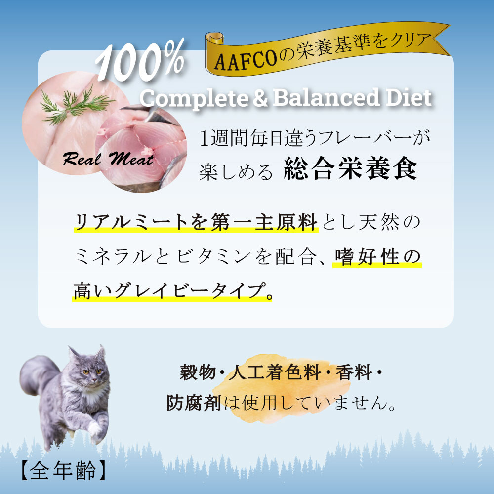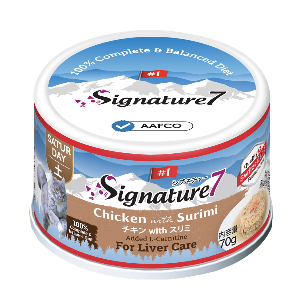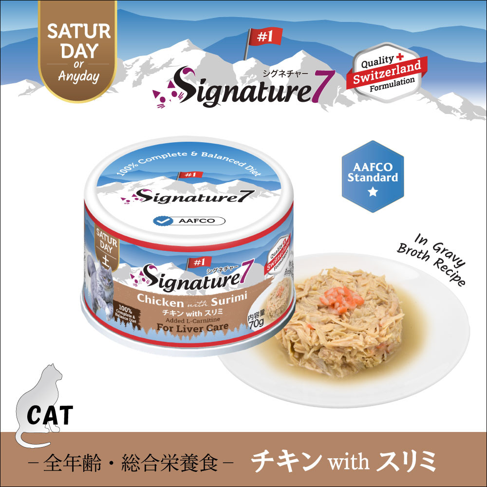1週間毎日違うフレーバーが楽しめる総合栄養食!■詳細説明・オールステージ・猫用総合栄養食「シグネチャー7」素材のエキスが溶け込んだスープが多めのグレービータイプ。・リアルミートを第一主原料とし、天然のビタミンとミネラルを配合。・AAFCO基準をクリアした全年齢対応の総合栄養食。穀物・人工着色料・香料・防腐剤は使用していません。・新鮮なチキンとスリミ(カニカマ)を使用。・L-カルニチン配合で肝臓機能をヘルシーサポート。■原材料チキン、カニカマ、大豆油、フレーバーエンハンサー、酵母エキス、ツナエキス、グアーガム、L-カルニチン、ビタミン&ミネラル、タウリン■保証成分粗たんぱく質12%以上、粗脂肪1.2%以上、粗繊維1%以下、粗灰分3%以下、水分87%以下■エネルギー71.82kcal/100g(1缶あたり50.27kcal)■賞味期限36ヶ月