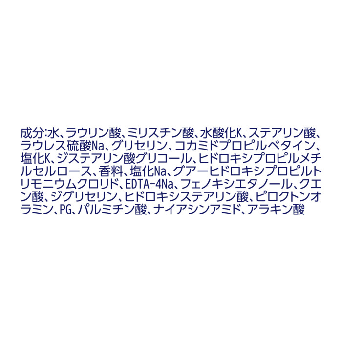 水、ラウリン酸、ミリスチン酸、水酸化K、ステアリン酸、ラウレス硫酸Na、グリセリン、コカミドプロピルベタイン、塩化K、ジステアリン酸グリコール、ヒドロキシプロピルメチルセルロース、香料、塩化Na、グアーヒドロキシプロピルトリモニウムクロリド、EDTA-4Na、フェノキシエタノール、クエン酸、ジグリセリン、ヒドロキシステアリン酸、ピロクトンオラミン、PG、パルミチン酸、ナイアシンアミド、アラキン酸