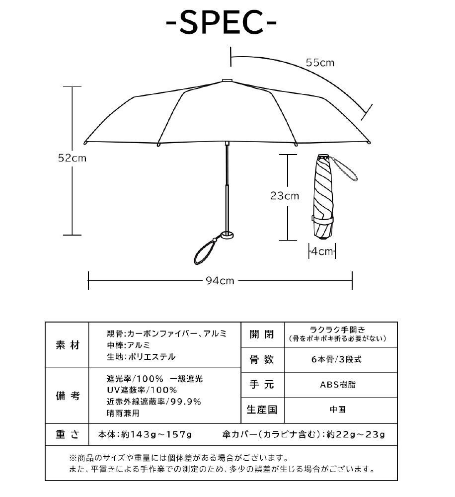 サイズ 全長:52.5cm 収納時の長さ:22.5cm 親骨:55cm 直径:94cm