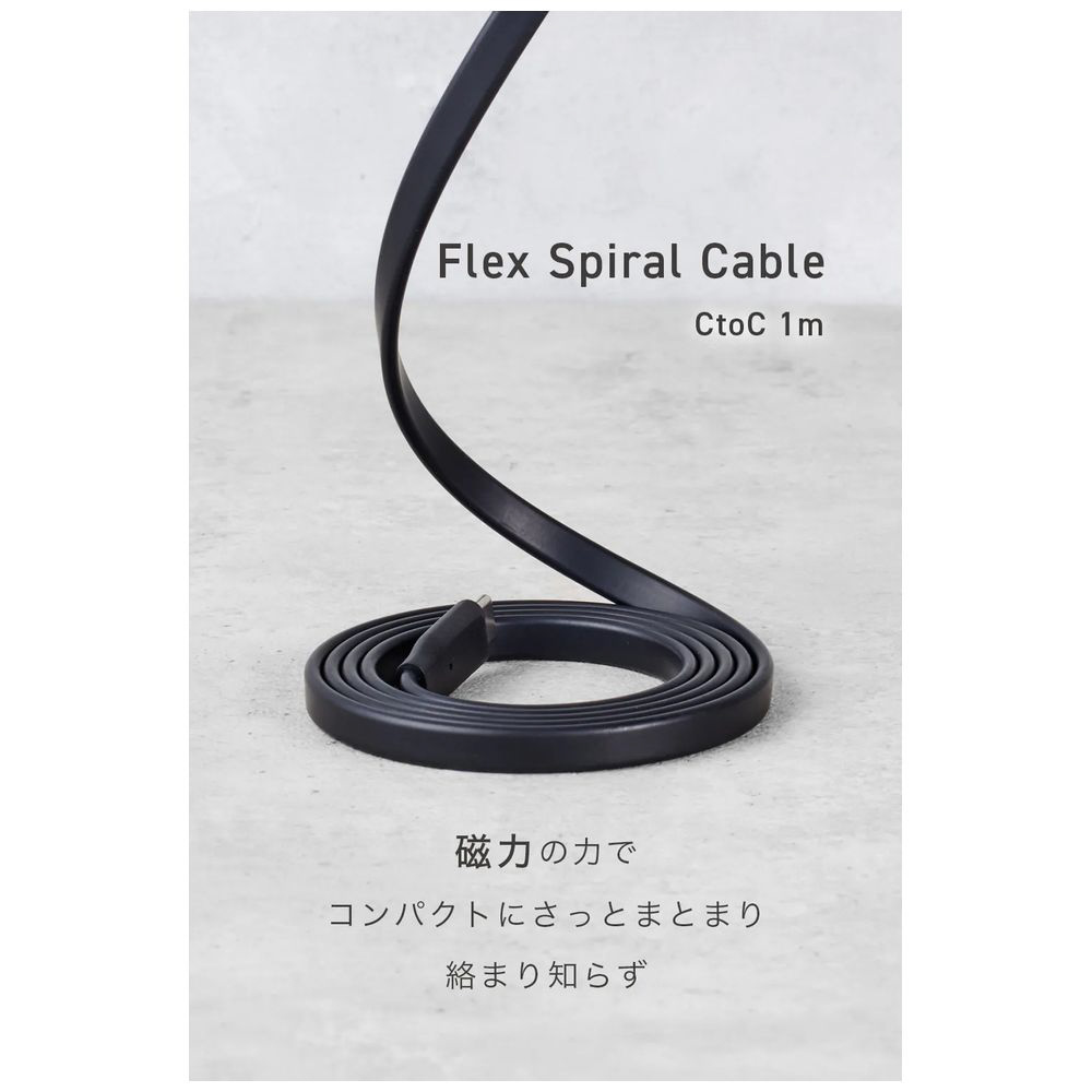 磁石を内蔵した薄いフラットタイプのUSB Cケーブル。コードリールのように、使う時は伸ばして、使い終われば厚みを抑えた渦巻き状に半自動的にくるくると巻き戻ります。