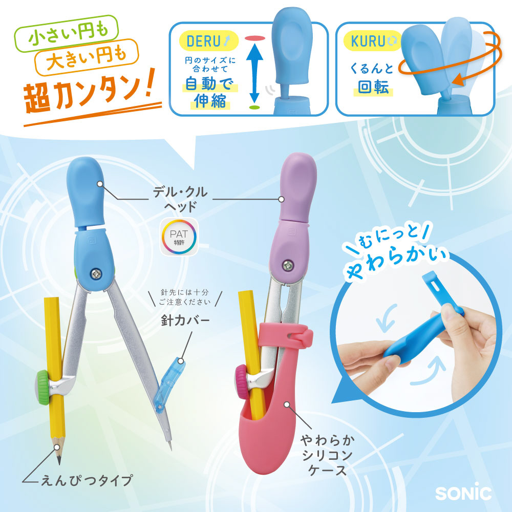 小学生必見!超カンタン 最先端コンパス、特許技術デル・クルヘッドで、つまんで・くるんと・まわすだけ!しっかり線がかける鉛筆タイプ。W針カバーで安心・安全。