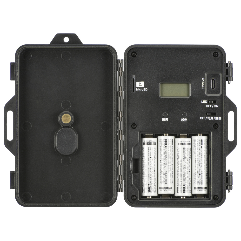 野外では乾電池、屋内監視用ではUSB-TypeC電源も使用可能で安心して使用できます。