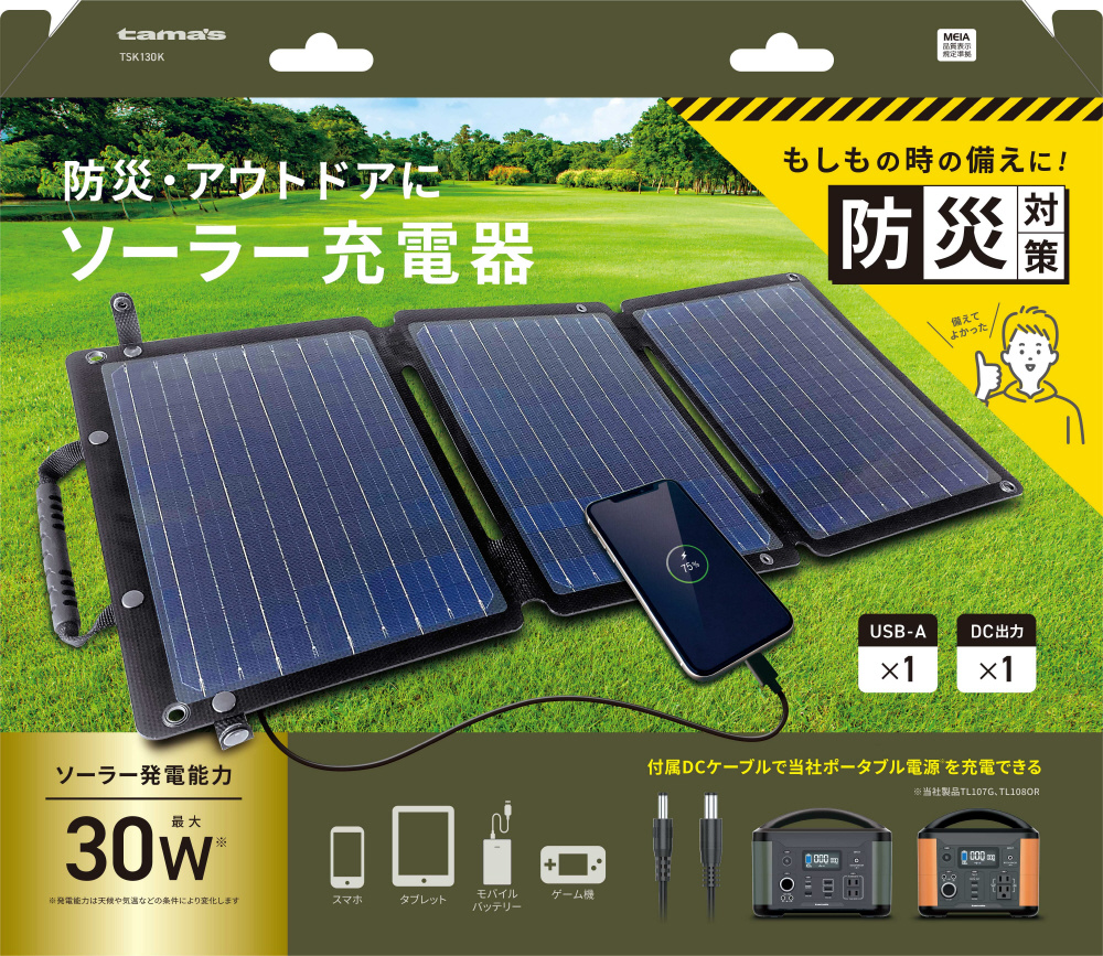●太陽光さえあれば充電可能な30W出力ソーラー充電器。防災対策・アウトドアに便利。