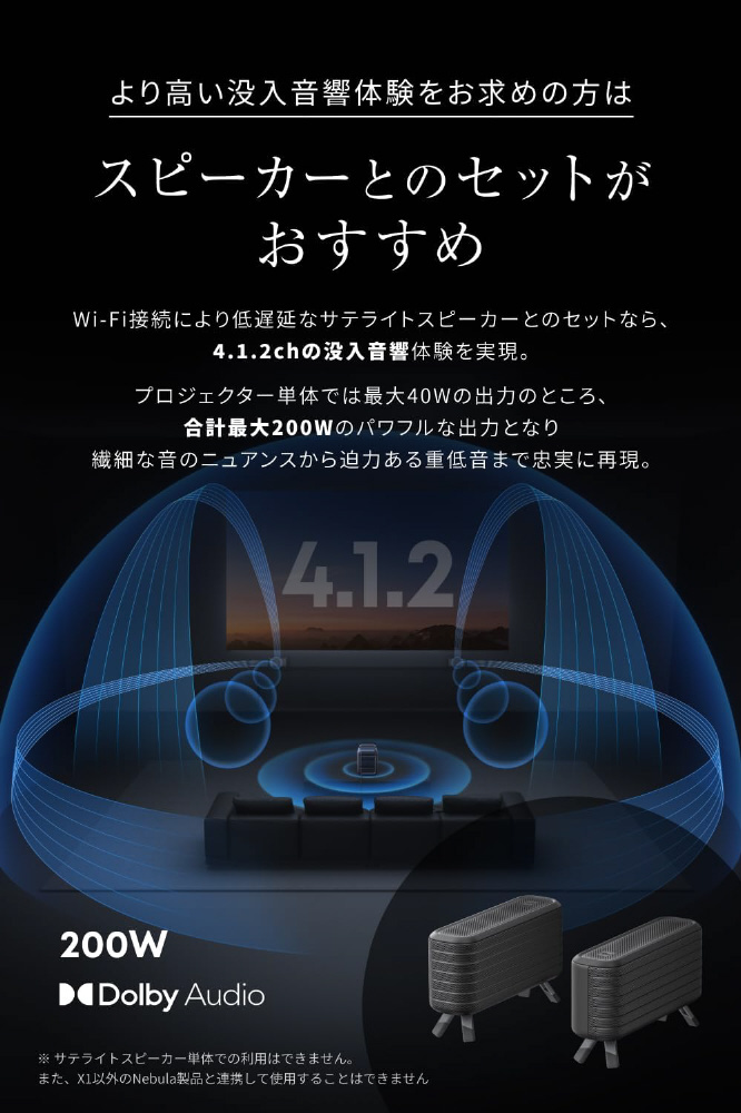 Wi-Fi接続により低遅延なサテライトスピーカーとのセットなら、4.1.2chの没入音響体験を実現。プロジェクター単体では最大40Wの出力のところ、合計最大200Wのパワフルな出力となり、繊細な音のニュアンスから迫力ある重低音まで忠実に再現。
