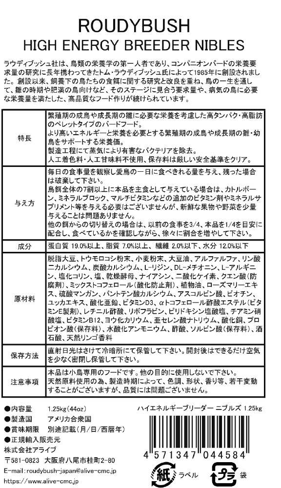 世界中の鳥たちに愛されているハイクオリティフード!■詳細説明・高品質な食事が必要な愛鳥たちに最も適した総合栄養食。・繁殖期の成鳥や成長期の雛に必要な栄養を考慮した高タンパク・高脂肪のペレットタイプのバードフードです。・より高いエネルギーと栄養を必要とする繁殖期の成鳥や成長期の雛・幼鳥をサポートする栄養価。・製造工程にて蒸気により有害なバクテリアを除去。・人工着色料・人工甘味料不使用、保存料は厳しい安全基準をクリア。■原材料脱脂大豆、トウモロコシ粉末、小麦粉末、大豆油、アルファルファ、リン酸二カルシウム、炭酸カルシウム、L-リジン、DL-メチオニン、L-アルギニン、塩化コリン、塩、乾燥酵母、ナイアシン、二酸化ケイ素、クエン酸(防腐剤)、ミックストコフェロール(酸化防止剤)、植物油、ローズマリーエキス、硫酸マンガン、パントテン酸カルシウム、アスコルビン酸、ビオチン、ユッカエキス、酸化亜鉛、ビタミンD3、αトコフェロール酢酸エステル(ビタミンE製剤)、レチニル酢酸、リボフラビン、ピリドキシン塩酸塩、チアミン硝酸塩、ビタミンB12、ヨウ化カリウム、亜セレン酸ナトリウム、酸化銅、プロピオン酸(保存料)、水酸化アンモニウム、酢酸、ソルビン酸(保存料)、酒石酸、天然リンゴ香料■保証成分蛋白質19.0%以上、脂質7.0%以上、繊維2.0%以下、水分12.0%以下■適応種フィンチ、カナリヤ、セキセイインコ、マメルリハなどの小型用■賞味期限18ヶ月