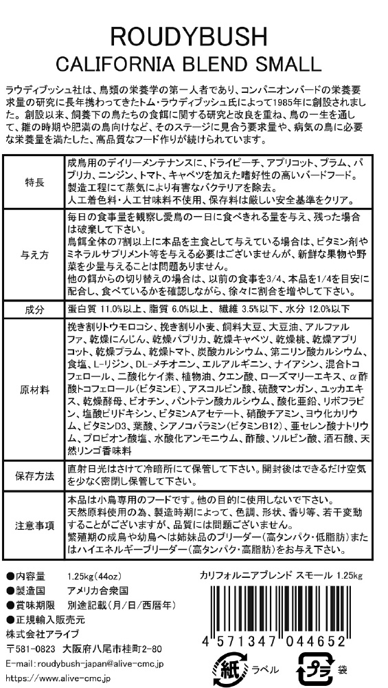 世界中の鳥たちに愛されているハイクオリティフード!■詳細説明・高品質な食事が必要な愛鳥たちに最も適した総合栄養食。・成鳥用のデイリーメンテナンスに、ドライピーチ、アプリコット、プラム、パプリカ、ニンジン、トマト、キャベツを加えた嗜好性の高いバードフードです。・製造工程にて蒸気により有害なバクテリアを除去。・人工着色料・人工甘味料不使用、保存料は厳しい安全基準をクリア。■原材料挽き割りトウモロコシ、挽き割り小麦、飼料大豆、大豆油、アルファルファ、乾燥にんじん、乾燥パプリカ、乾燥キャベツ、乾燥桃、乾燥アプリコット、乾燥プラム、乾燥トマト、炭酸カルシウム、第二リン酸カルシウム、食塩、L-リジン、DL-メチオニン、エルアルギニン、ナイアシン、混合トコフェロール、二酸化ケイ素、植物油、クエン酸、ローズマリーエキス、α酢酸トコフェロール(ビタミンE)、アスコルビン酸、硫酸マンガン、ユッカエキス、乾燥酵母、ビオチン、パントテン酸カルシウム、酸化亜鉛、リボフラビン、塩酸ピリドキシン、ビタミンAアセテート、硝酸チアミン、ヨウ化カリウム、ビタミンD3、葉酸、シアノコバラミン(ビタミンB12)、亜セレン酸ナトリウム、プロビオン酸塩、水酸化アンモニウム、酢酸、ソルビン酸、酒石酸、天然リンゴ香味料■保証成分蛋白質11.0%以上、脂質6.0%以上、繊維3.5%以下、水分12.0%以下■適応種コンゴウインコ類・バタン類(小型)、オカメインコ、ラブバード、アケボノインコ類、メキシコインコ類/ウロコインコ類、ローリー、クサインコ類、ヨウム、オキナインコ、ボウシインコ類、オオハナインコなどの中型以上用■賞味期限18ヶ月