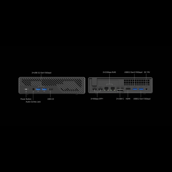 アクセスしやすい本体正面には3つのUSBポートを搭載し、背面には2つの2.5G LANポートに加えてHDMI、USB-C、USB 3.2端子を備えるだけでなく、超高速ネットワーク通信を可能にする10G SFP+端子も2つ搭載しています。