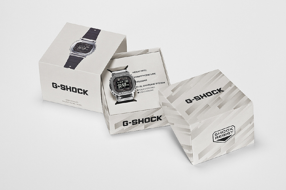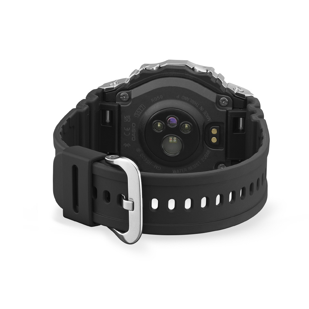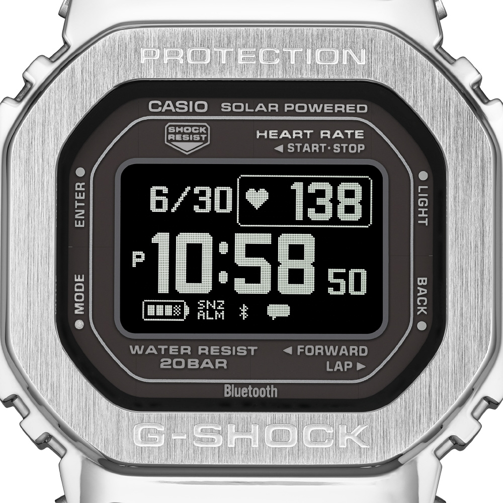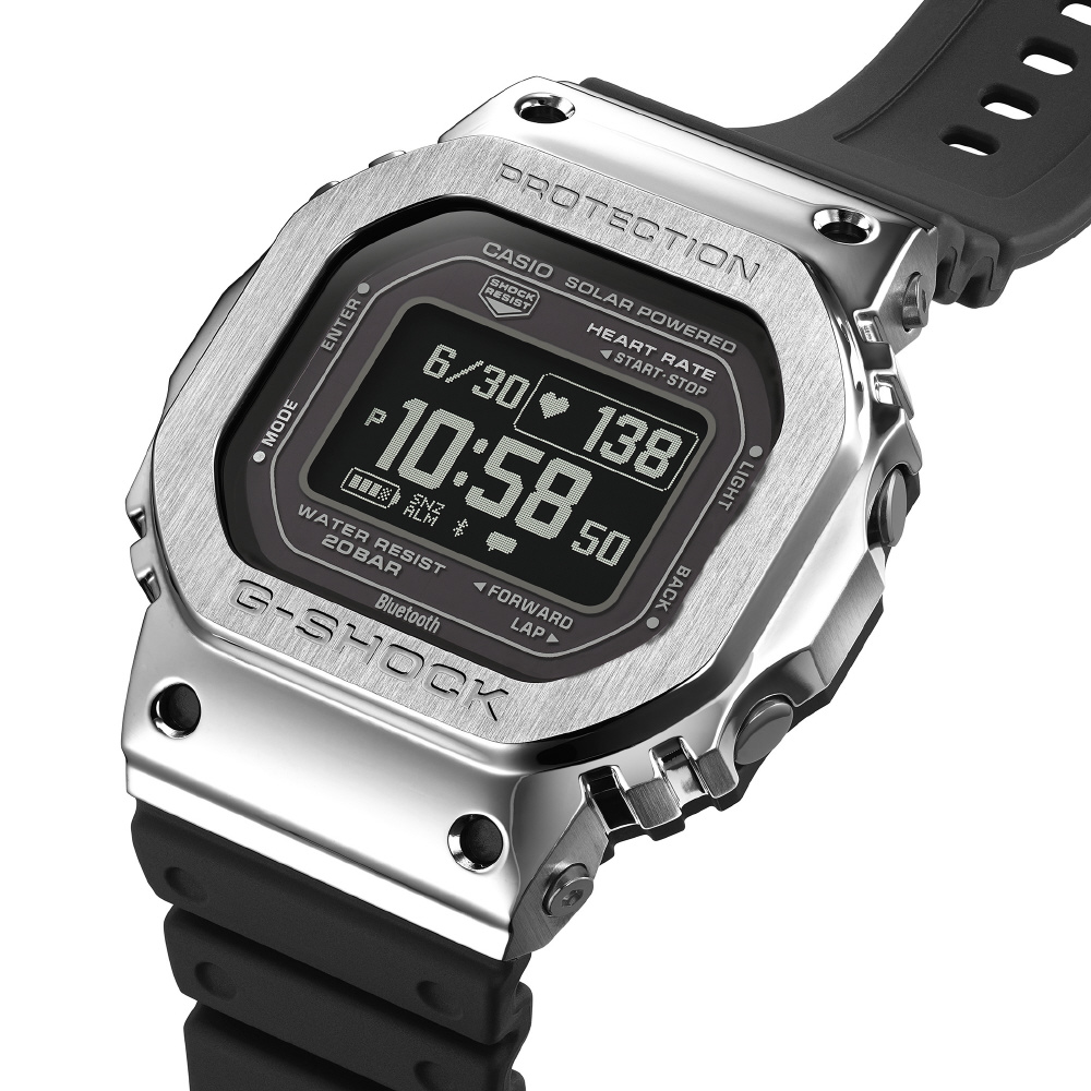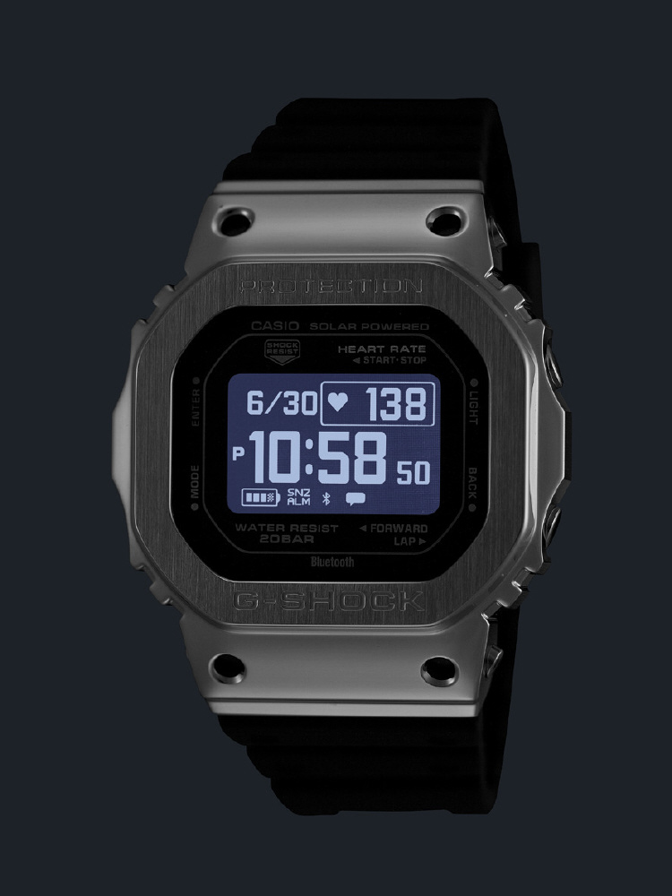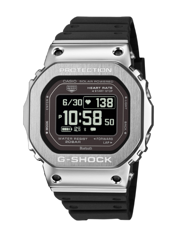DW-H5600の機能はそのままに、ベゼル部分にステンレススチールを採用し、より幅広いシーンで着用できる仕上がりとしました。さらに、ベゼルのディンプル部分に4カ所の切削穴を設けることで、ハイテクギア感とスポーティーな印象を高めています。また、裏蓋にはカーボンファイバー強化樹脂ケースを採用。