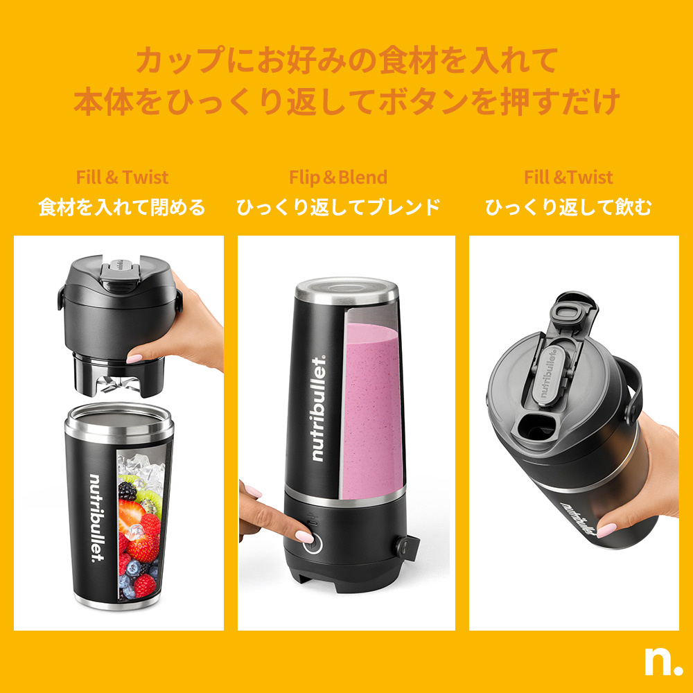 持ち運べる、保冷性に優れたコードレスタイプのパーソナルブレンダー*1 コンパクトなのに、nutribulletならではのパワフルブレンド。 キッチンでも、ジムでも、オフィスでも自由に使える。 冷たさをキープするステンレス製真空断熱カップで、いつでもおいしく栄養補給。*1 パーソナルブレンダー:容量0.6L以下のミキサー/ブレンダー