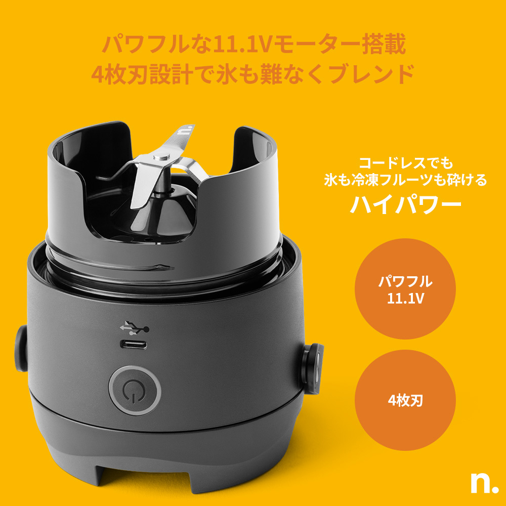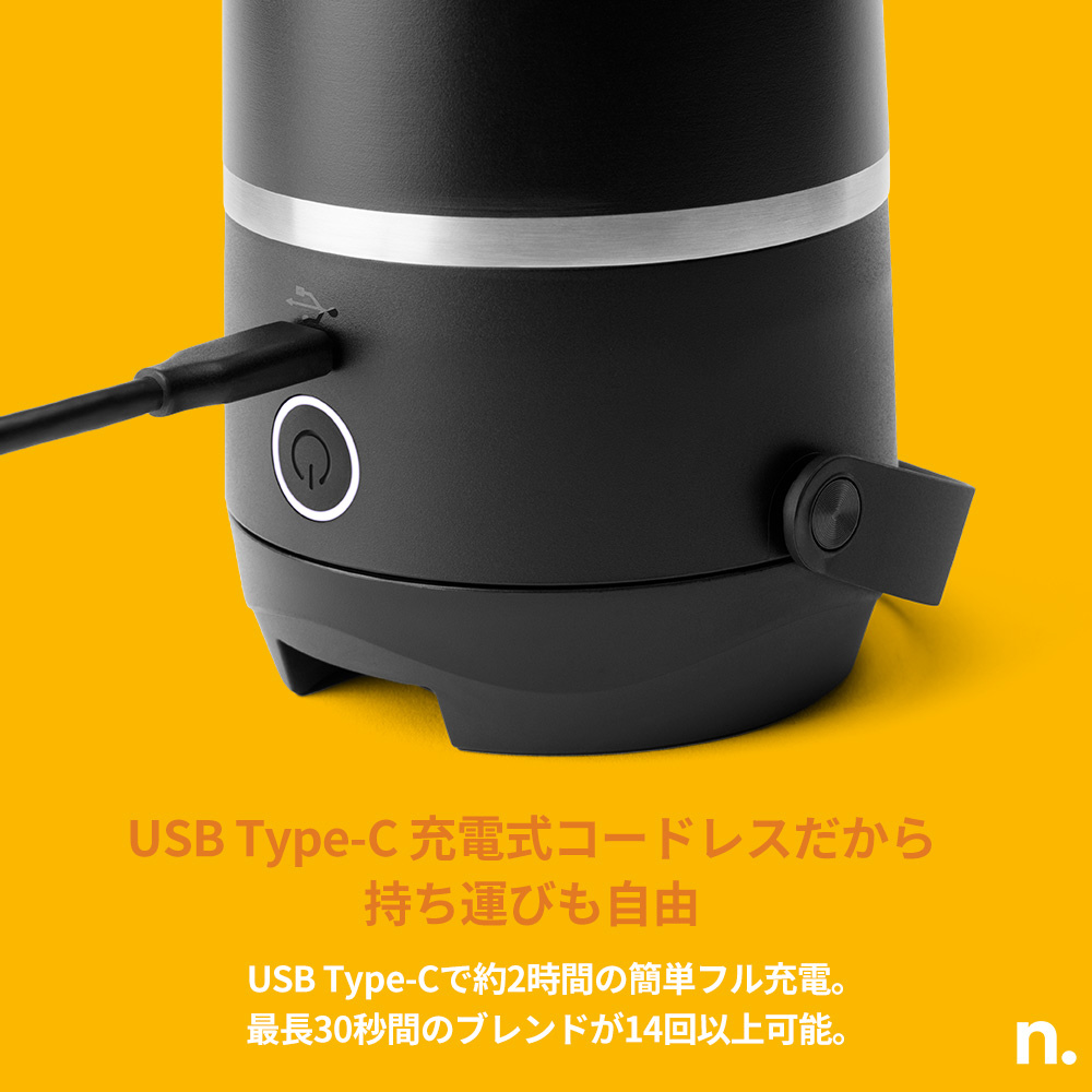 コードレス設計のコンパクトブレンダー。タンブラーのように持ち運べて、USB-Cで簡単充電。USB Type-Cで約2時間の簡単フル充電、14回以上ブレンド可能。キッチンでも、ジムでも、公園でも。冷たいスムージーも、プロテインも、どこでも栄養チャージ。