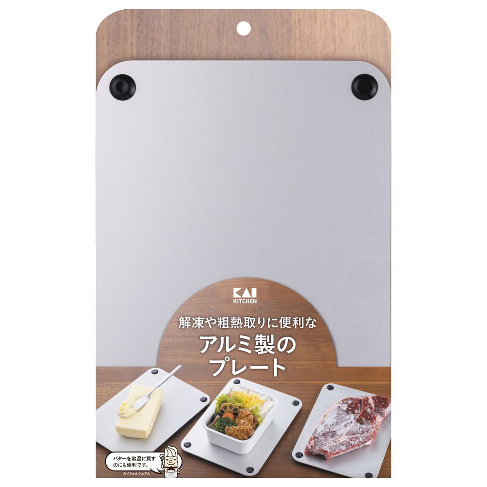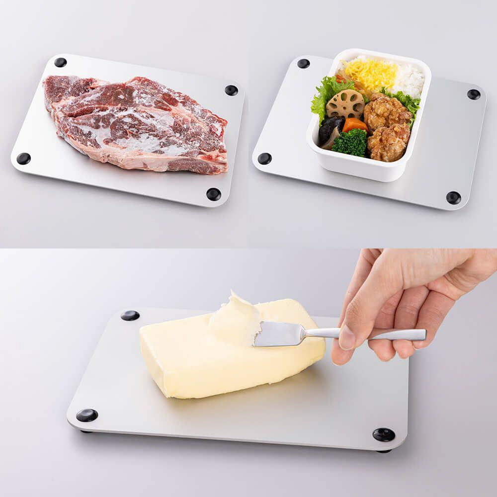 解凍や粗熱取りに便利なアルミ製のプレート。面倒な「バターを室温に戻す」時間を短縮できる。お菓子を作りたいと思ったときにすぐに作業ができます。冷凍したお肉の解凍や、ほかほかのお弁当の粗熱取りなどお料理にも大活躍。