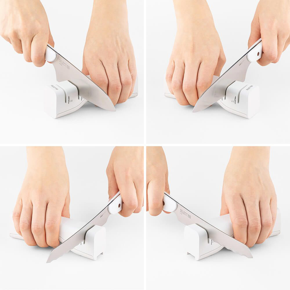 使いやすい道具はシンプルで美しく、手になじむ、それがセレクト100の考え方。料理のプロたちが厳しくチェックしたうえに考え抜かれたキッチンツールシリーズです。シャープナー(両刃包丁・ブレッドナイフ用)。両刃包丁だけでなく、ブレッドナイフも研ぐことができます。(特許第7399601号)収納しやすいコンパクトな設計で、フック掛け収納も可能。本体に研ぎ回数の目安を表記しています。握りやすい形状で、両利きに対応しています。(特許第7399601号)