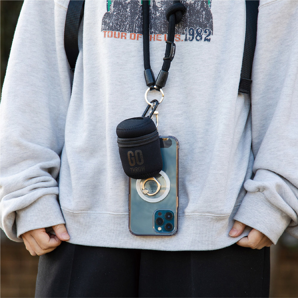 カラビナが付いているので、いつものバッグやスマホショルダーにも取り付けられ、