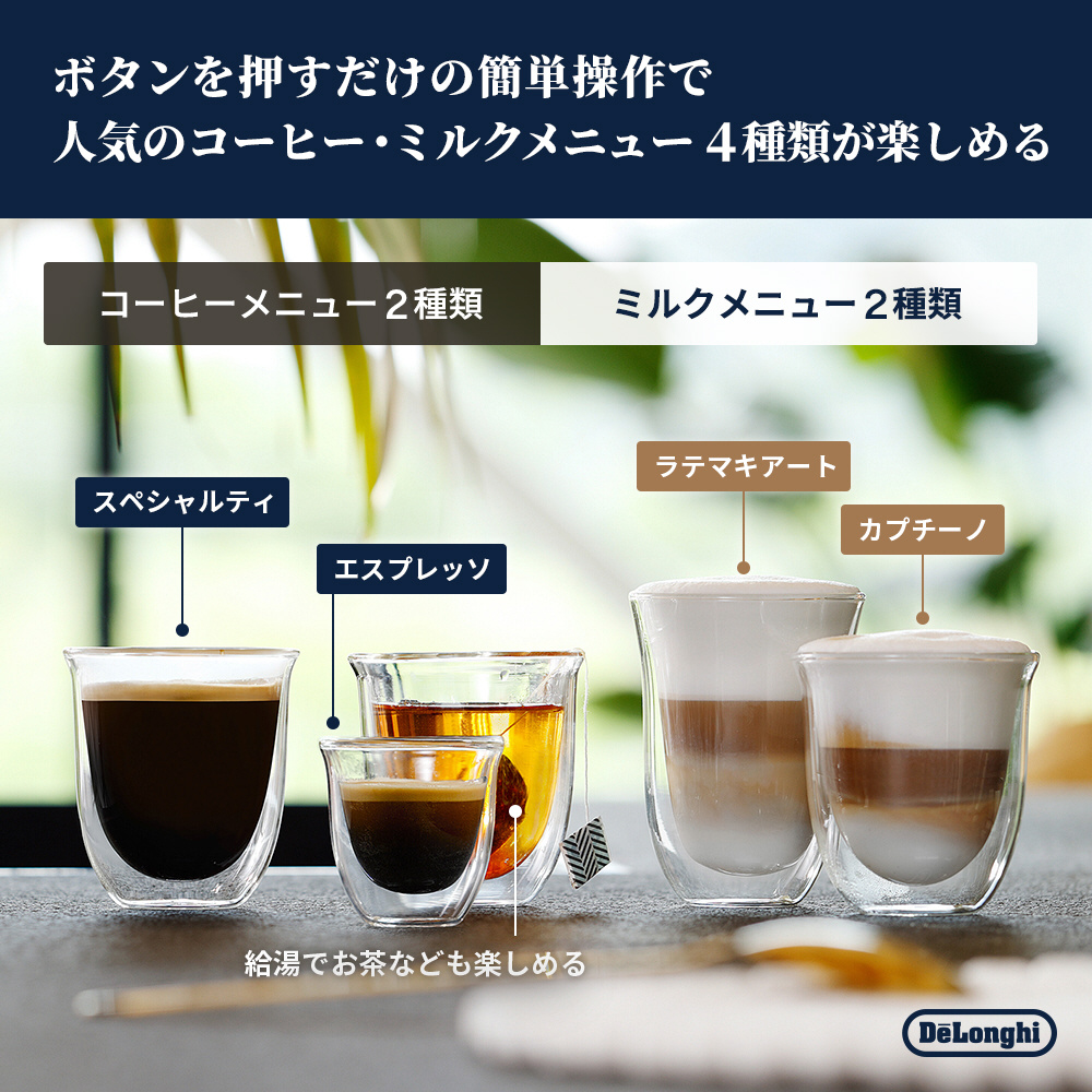 本格的なエスプレッソからふわふわ泡のカプチーノ/ラテマキアートまで、カフェクオリティのコーヒーをワンタッチで手軽に、ご自宅で楽しめます。