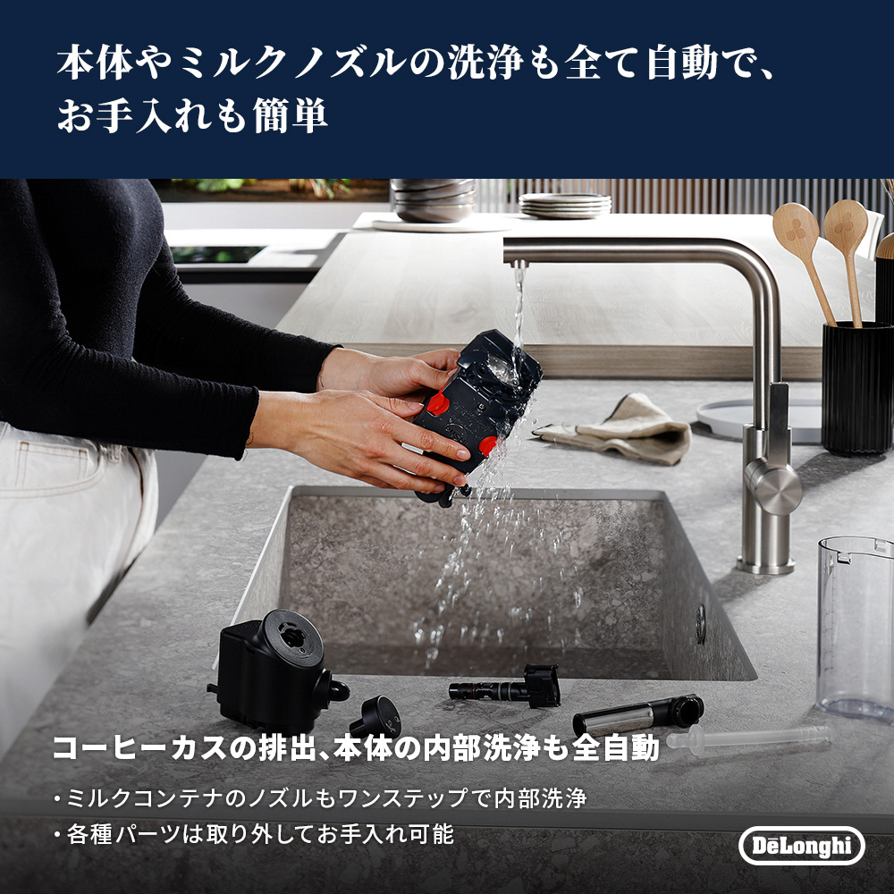 自動内部洗浄機能で本体やミルクノズルの洗浄も全て自動で、日々のお手入れはカス受けに溜まったカスを捨てるだけで、お手入れ簡単。
