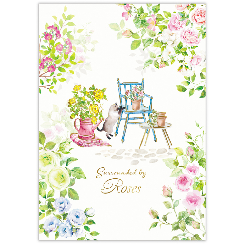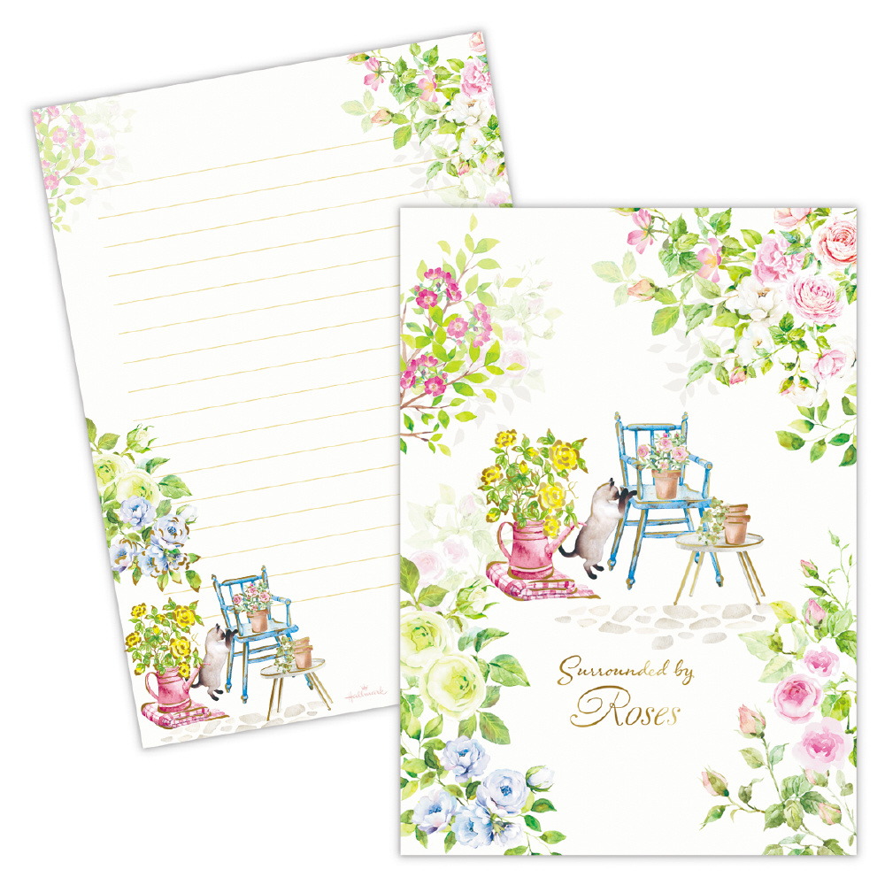 新緑〜初夏のシーズンに長くご利用いただけるレターシリーズ「チェンジズ・オブ・ネイチャー」。色とりどりのバラが咲き誇る、華やかなローズガーデンを散策している情景をイメージしたレターパッド。みずみずしい緑とバラが、初夏の爽やかな息吹を感じさせるデザイン。好奇心を覗かせる可愛らしいシャム猫がポイントです。
