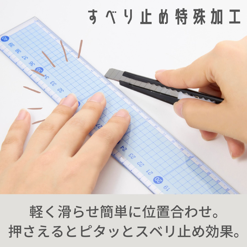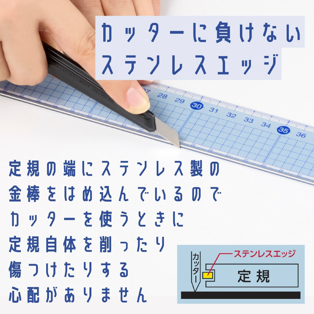 ■カッターに負けないステンレスエッジつきで定規本体が傷つきにくい