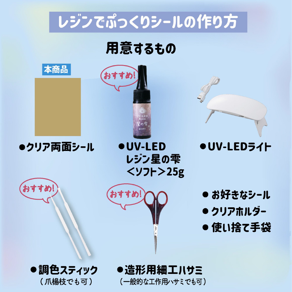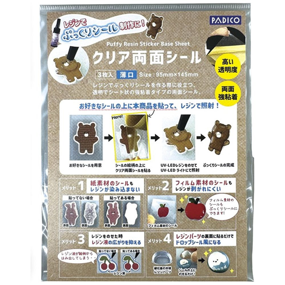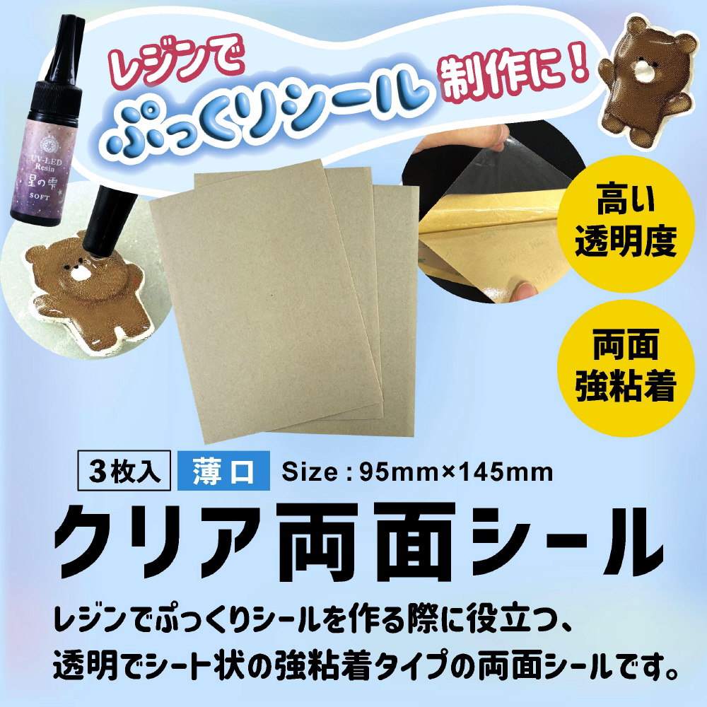 レジンでぷっくりシールを作る際に役立つ、透明でシート状の強粘着タイプの両面シールです。