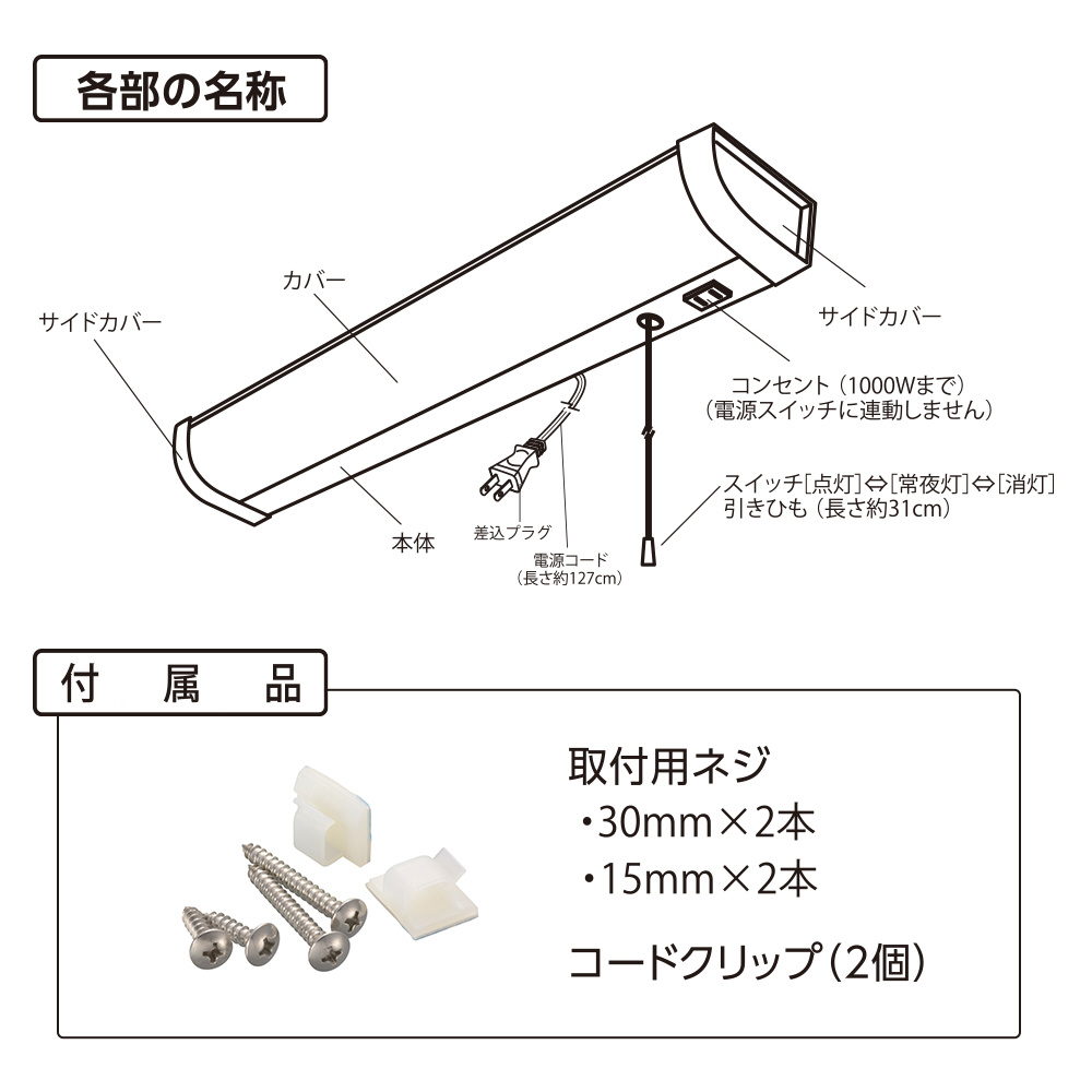 ■ 付属品:取付用ネジ(30mm×2本、15mm×2本)、コードクリップ(2個)