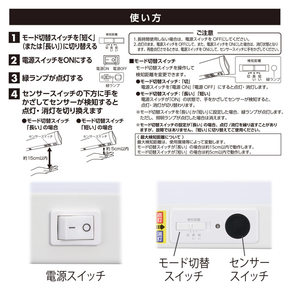 ● センサー検知距離を変更できるモード切替スイッチ付き、検知距離:短い…約5cm、長い…約15cm