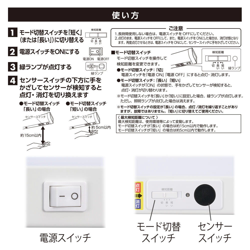 ● センサー検知距離を変更できるモード切替スイッチ付き、検知距離:短い…約5cm、長い…約15cm