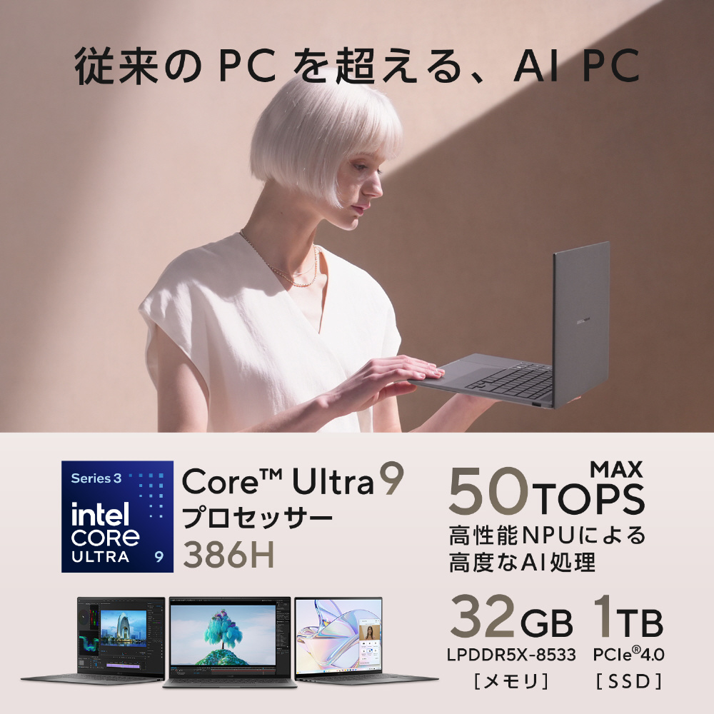 マックス50 TOPS NPUによる優れたAIパフォーマンスを実現するインテル Core Ultra 9 プロセッサー 386Hを搭載。コンテンツの作成・編集などをすばやくこなし、生産性を向上します。また、デュアルファン・ベイパーチャンバー搭載とジオメトリックグリルデザインの通気孔による冷却機能で、高いパフォーマンスを維持します。