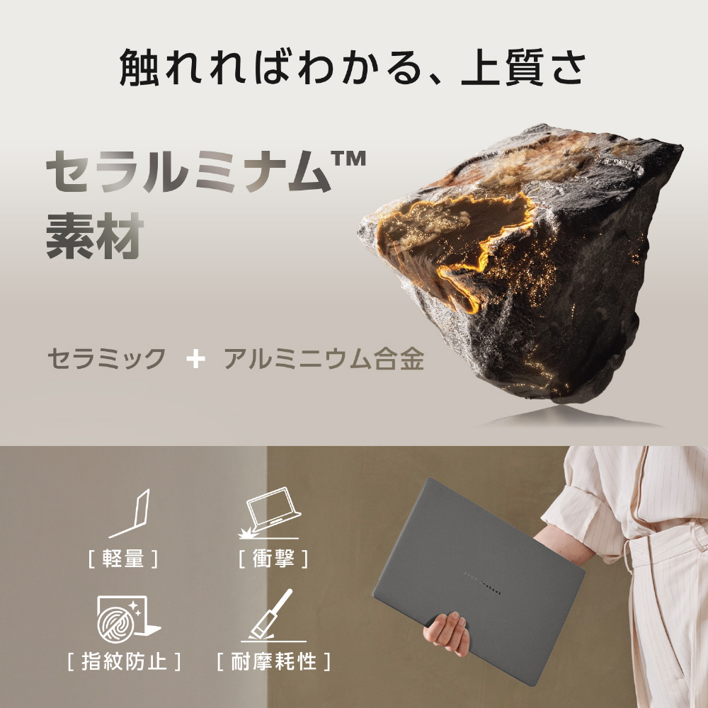 セラミックの美しい質感とアルミニウム合金の軽さ・堅牢性を兼ね備えた独自のセラルミナム素材を本体に採用。傷や汚れにも強く、インスピレーションを生む現代的なカラーと、CNC加工の精密な職人技が相まって、他にない唯一無二のノートPCとして長い間使用いただけます。