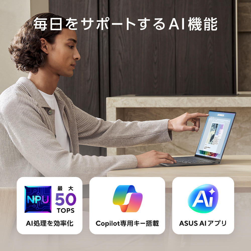 毎日のAIアシスタント Microsoft Copilotに加え、マルチメディアデータを自動でカテゴライズし、整理をしてくれるソフトウェアStoryCubeやカメラがユーザーの有無を認識してディスプレイの明度を調整するAiカメラなど、独自のAI機能も各種搭載。面倒なことはAIに任せて、生まれた時間を有意義に活用できます。