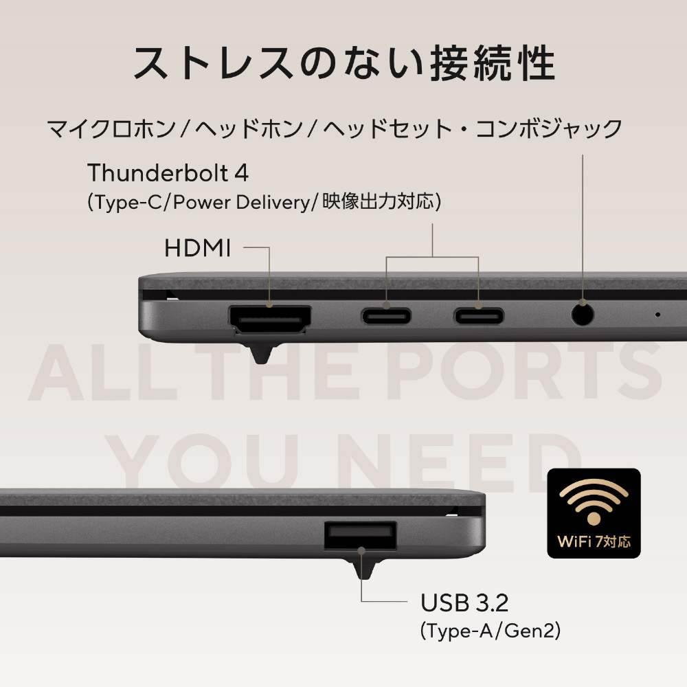 スリムなボディに高速接続を可能にするThunderbolt 4 (Type-C)をはじめ、USB 3.2 (Type-A/Gen2)、HDMIといった豊富なインターフェースを搭載。どこにいても生産性を損ないません。また、Wi-Fi 7規格にも対応し、長期的な使用を見据えた次世代の接続性を備えています。