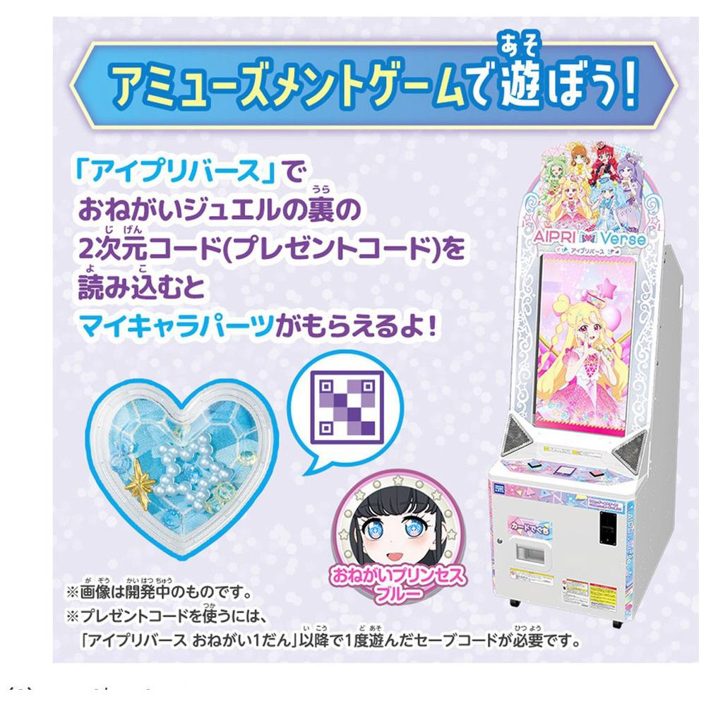 おねがいジュエルの裏の2次元コード(プレゼントコード)を「アイプリバース」に読み込ませると、マイキャラパーツがもらえます。
