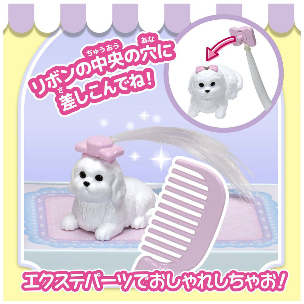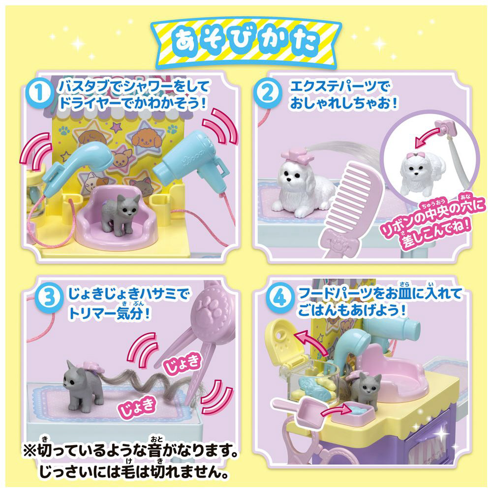 ワンちゃんとネコちゃんをシャワーやドライヤーでお世話したり、音の出るじょきじょきハサミやクシでトリミングごっこができます。