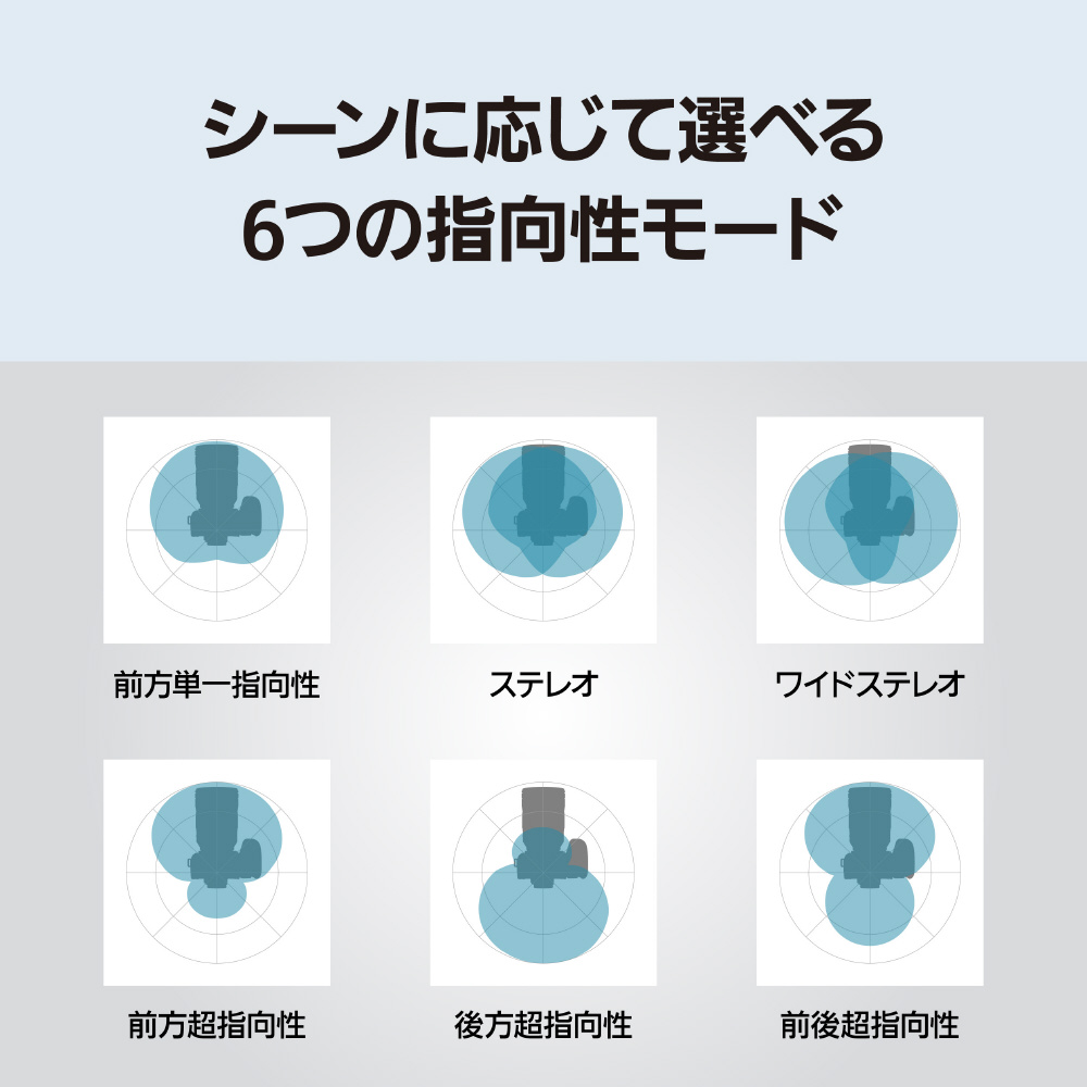 新開発マイクアレイによるクリアで臨場感のある録音が可能なことに加えて、さまざまな録音環境でノイズを抑制。シーンに応じて選べる「6つの指向性モード」により、自由度の高い、多様な録音スタイルで動画撮影をサポートします