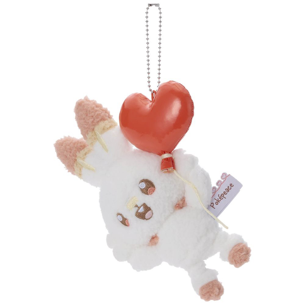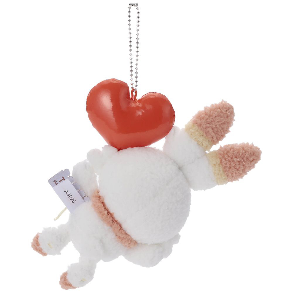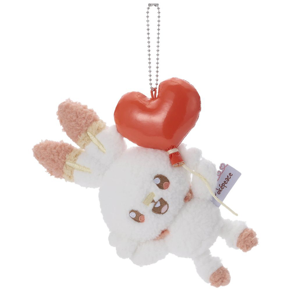 オレンジのハート型風船にぶら下がった可愛いヒバニーのぬいぐるみマスコットです。