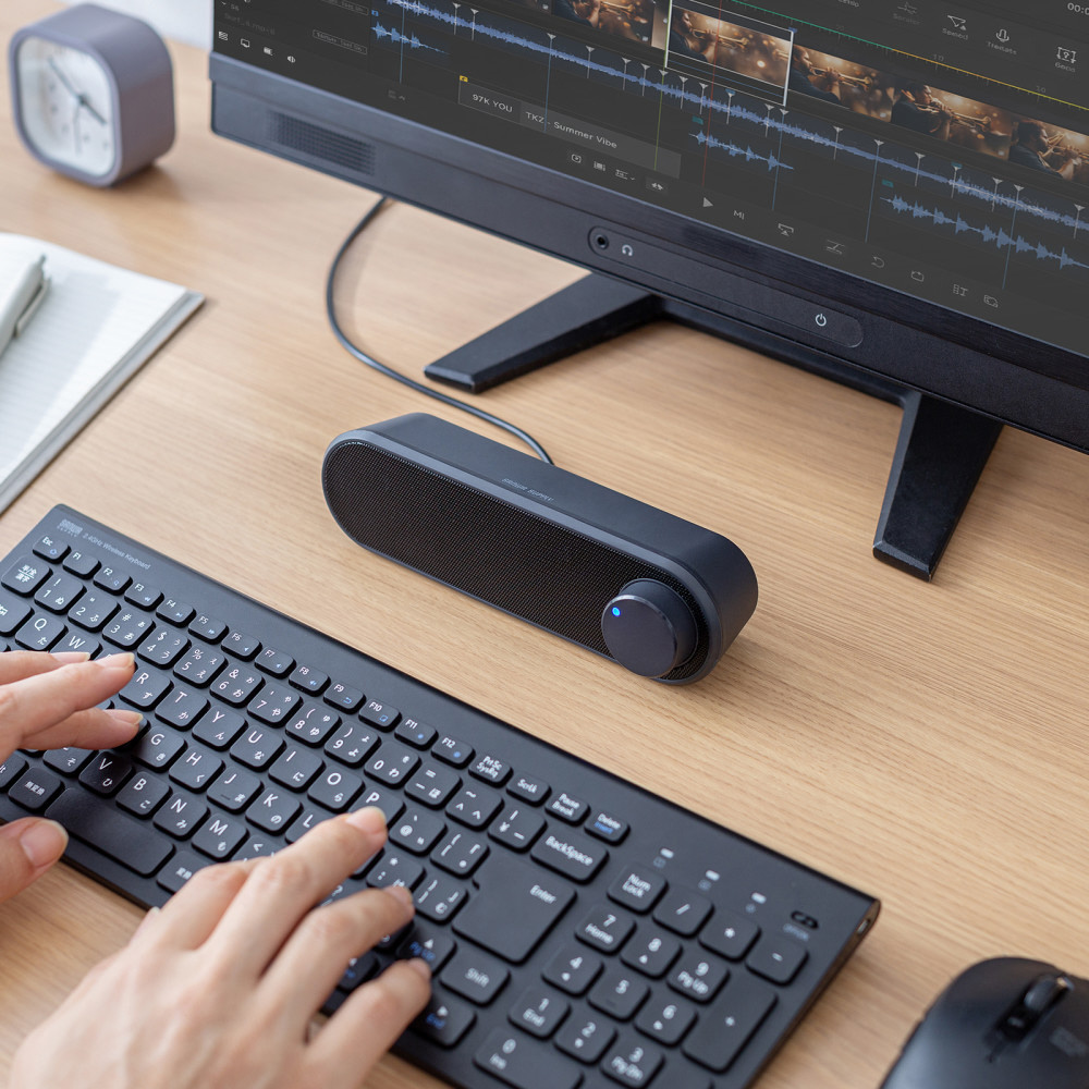 USBケーブル1本で接続可能な最大6W(3W+3W)ステレオ出力のUSBスピーカー。USB A・Type-C両対応。横置きスリム設計と約2mロングケーブルで省スペース設置を実現する小型軽量モデル。