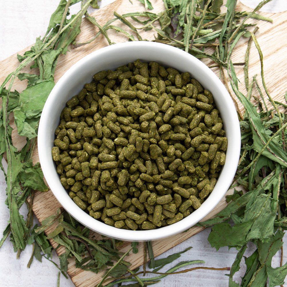 チモシーミール、アルファルファミール、燕麦、脱脂大豆、タピオカでんぷん、ホミニーフィード、乾燥おから、ビートパルプ、ビール酵母、たんぽぽの葉、菜種油、ハチミツ、海藻粉末、ニンジン粉末、パパイヤ抽出物、ステビア、アミノ酸類(DL−メチオニン、L−トリプトファン)、ミネラル類(食塩、リン酸一水素ナトリウム、硫酸銅、硫酸コバルト、ヨウ素酸カルシウム)ビタミン類(コリン、ナイアシン、ビタミンE、パントテン酸、ビタミンB6、ビタミンA、ビタミンC、ビタミンB2、葉酸、ビオチン、ビタミンD3)