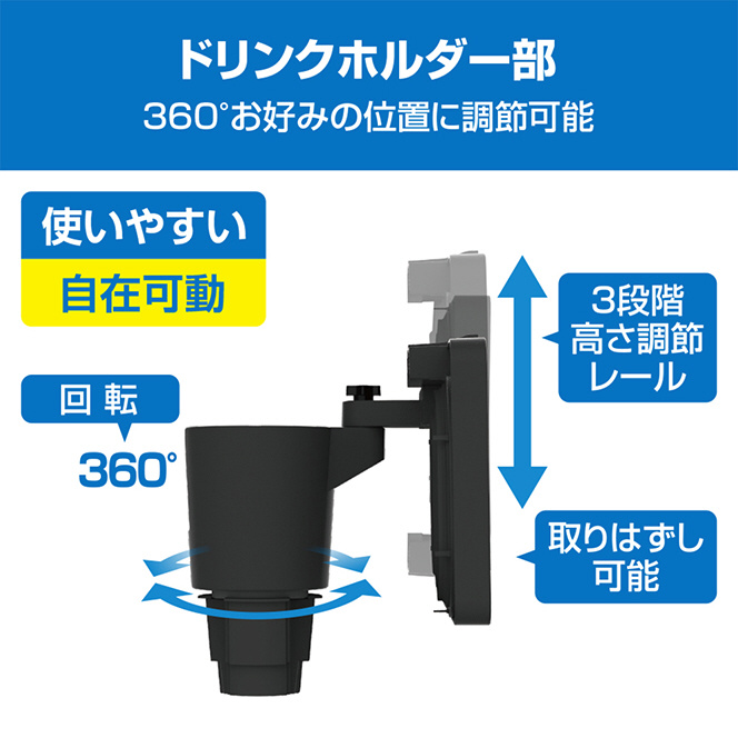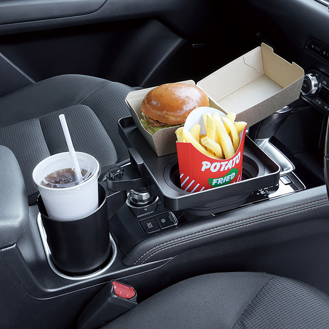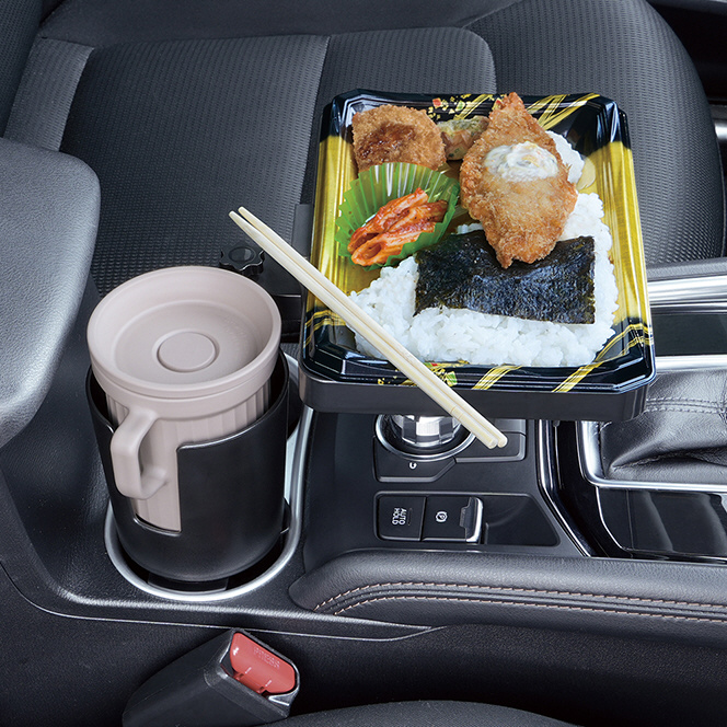 ドリンクホルダー部には飲料容器、BIGサイズのカップ麺や取っ手付きマグカップ等を入れることができます。