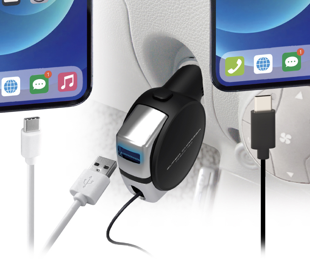 コード巻取りリール式Type-CとUSB-Aポートで2台同時充電!車載用スマホ/タブレット充電器の高出力タイプ