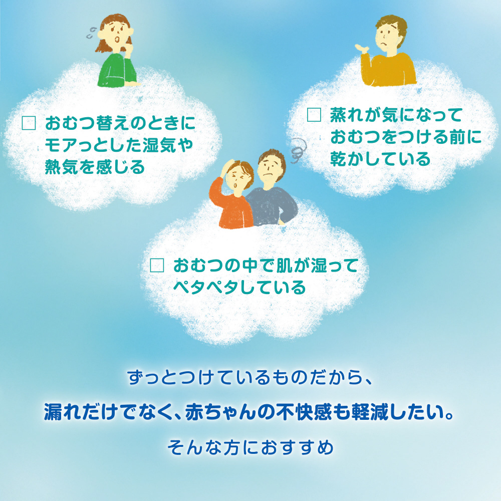 なめらかに肌をすべるようなやさしい肌ざわり。独自! Sカーブフィット独自!1秒吸収*2シート12時間の吸収力2.5倍*3 伸びるのびのびベルト*足回り・腰回りにおいて。