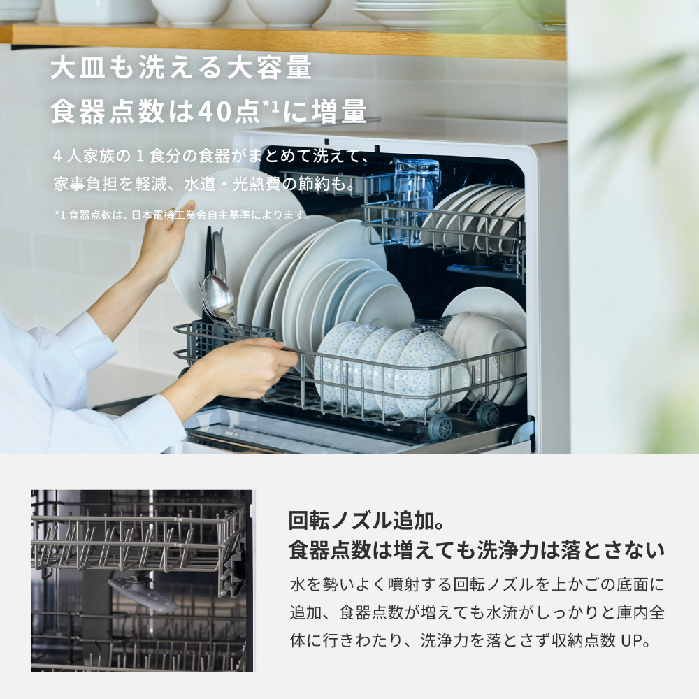 食器点数が従来の36点から40点(4人家族1食分相当)に増え、直径28cmまでのフライパンなどの調理器具もまとめて洗浄可能。